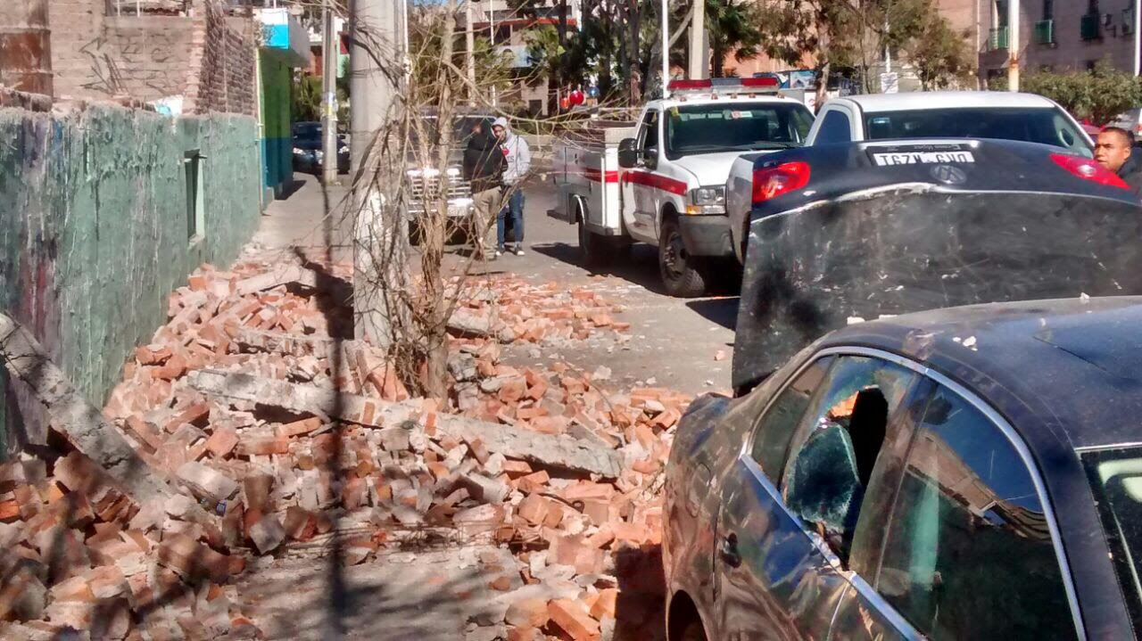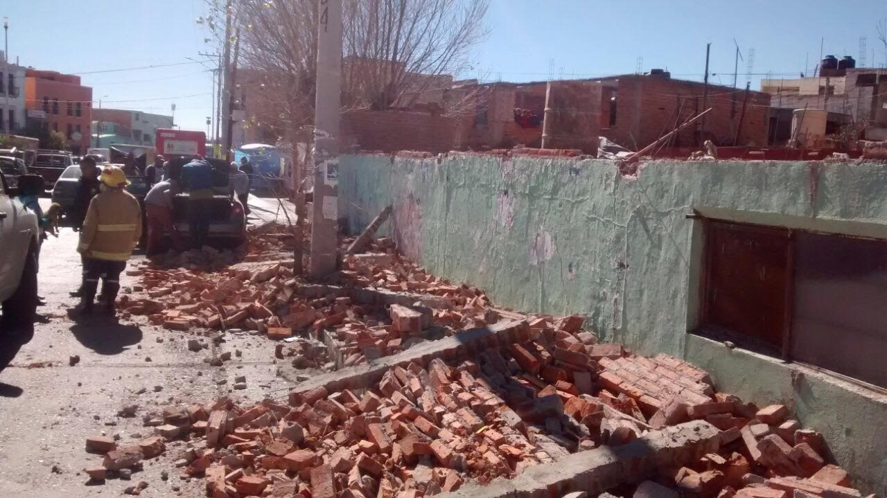 Guadalupe, Zac.- Debido a los fuertes vientos registrados este sábado, una barda colapsó y cayó encima de un automóvil Volkswagen Bora que quedó dañado de las puertas, la cajuela y el medallón.