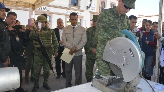 Zacatecas, Zac.-Frente al Palacio Municipal se llevo a cabo el evento que marca el inicio de la Campaña de Canje de Armas por parte del 53 batallón de infantería de la Secretaría de la Defensa Nacional (Sedena) en coordinación con el gobierno municipal.