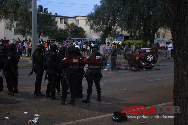 Las personas que tripulaban la camioneta salieron disparadas y quedaron tiradas sobre el pavimento; por fortuna, los vehículos que le precedían se detuvieron a tiempo para no arrollarlos, por lo que se evitó una tragedia mayor.