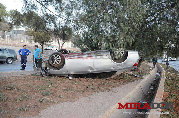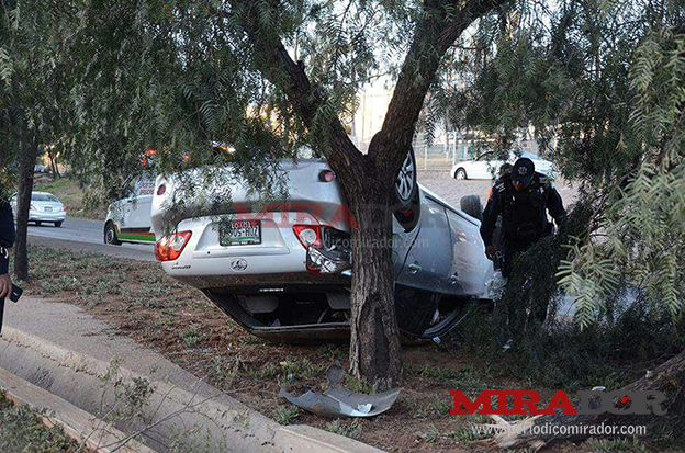 Guadalupe, Zac.- Minutos antes de las 18:00 horas, el conductor de automóvil Corolla de modelo reciente, sufrió un accidente tipo volcadura sobre el Bulevar López Portillo con dirección a Zacatecas cuando intentó esquivar un objeto metálico que se encontraba sobre el asfalto.