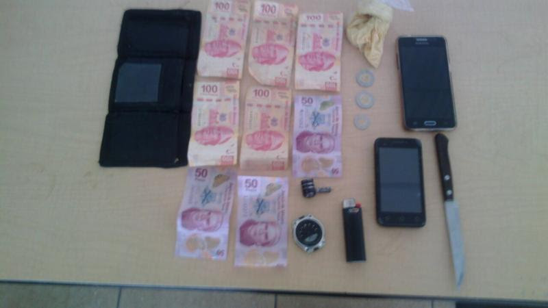 Entre la ropa, a Carlos N., de 21 años, con domicilio en la colonia Alma Obrera, le encontraron dos teléfonos celulares, una cartera con 650 pesos en varios billetes, un cuchillo de cocina y una bolsa de plástico transparente que contenía pegamento.