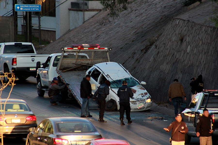 Según las autoridades, en el vehículo iban Alan de 31 años de edad, quien conducía el vehículo y Jocelyn de 26 años, los cuales circulaban con dirección a la capital del estado sobre la calzada Universidad y donde, al parecer, Alan dio un giro brusco y cayó hacia el Eje Vial Metropolitano a la altura del lienzo charro, quedando con las llantas hacia arriba.