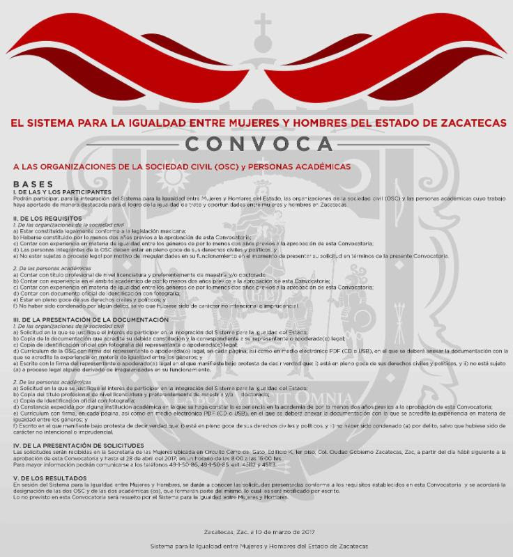 Zacatecas, Zac.- Este viernes 28 de abril, cierra la convocatoria para integrar el Sistema para la Igualdad entre Mujeres y Hombres del Estado de Zacatecas, dirigida a Organizaciones de la Sociedad Civil (OSC) y personas del ámbito académico.La convocatoria prevé, como requisitos generales para OSC y personas del ámbito académico con interés en participar: contar con título profesional de nivel licenciatura (maestría y/o doctorado, de preferencia) y haberse constituido como organización durante los dos años anteriores.