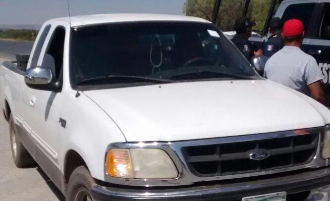 Ahí marcaron el alto al conductor de una camioneta Ford Pick Up, modelo 1997, color blanco y placas de circulación del estado de Zacatecas, misma que contaba con reporte de robo.