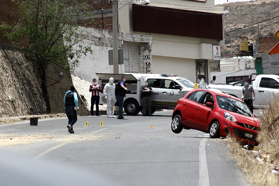 Personal de los Servicios Periciales recabaron los indicios del hecho y comentaron que la unidad iba en movimiento en el sentido Zacatecas a Guadalupe, cuando sus ocupantes fueron agredidos, por lo que el vehículo chocó en su costado delantero izquierdo contra el muro del Cerro.