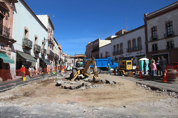 En la Hidalgo se está realizando un sondeo de una bóveda secundaria, el desazolve de una caja pluvial ubicada en la plazuela de la Caja, y corrección de niveles y elevación de un registro eléctrico en la banqueta de la plazuela Goitia, trabajos que no obstaculizarán el la circulación de automovilistas ni peatones.