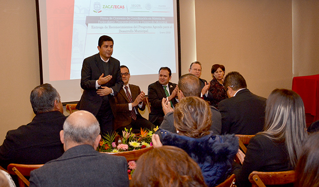 Zacatecas, Zac.-En el marco de la firma del Convenio de Coordinación en Materia de Federalismo, Descentralización y Desarrollo Municipal, el alcalde Enrique Guadalupe Flores Mendoza fue reconocido por alcanzar la posición más destacada del estado en el programa Agenda para Desarrollo Municipal, al contar con la mejor evaluación en sus indicadores de gestión y desempeño, potencializando así la mejora de sus capacidades institucionales y el cumplimiento de sus obligaciones constitucionales.
