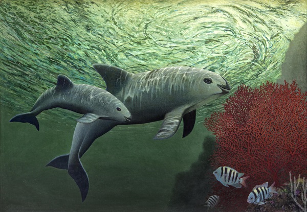 Tímida, pequeña y evasiva, la vaquita marina es una marsopa endémica de México, cuyo nombre científico es Phocoena sinus. Esta especie que llega a medir 1.5 metros y pesar 48 kilos, está en peligro de extinción y para hacer conciencia de su valor en la vida del planeta se realizará mañana sábado una procesión que saldrá del Museo Rufino Tamayo de la Ciudad de México a las 10:00 horas (Imagen: Pintura acrílica del artista William Sheperd.)