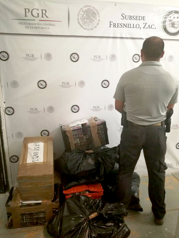 Elementos de la Agencia de Investigación Criminal (AIC), adscritos a la subsede en Frenillo, lograron retirar del mercado dos mil 250 piezas en formato DVD y dos mil 150 piezas en formato CD, arrojando un total de cuatro mil 400 piezas falsas, localizadas en establecimientos informales en la vía pública de la ciudad de Fresnillo, Zacatecas.