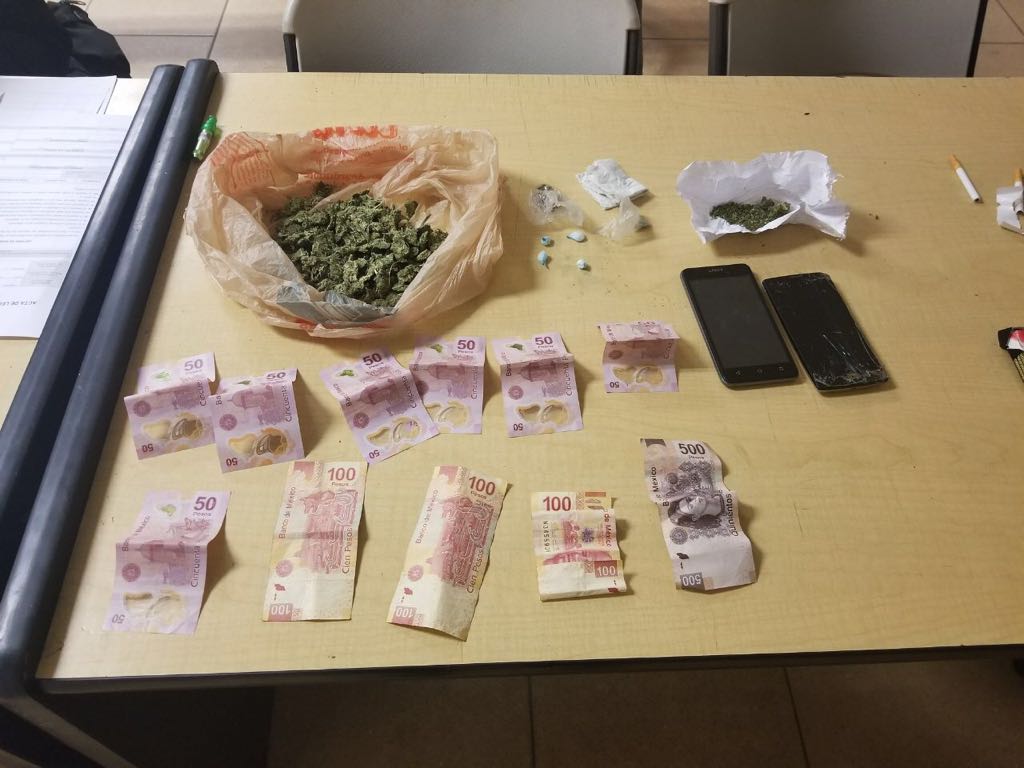 Además, también estaban en posesión de cuatro dosis de polvo blanco, con las características de la cocaína en polvo, así como la cantidad de mil 50 pesos en billetes de diversas denominaciones.