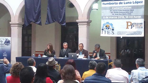 Zacatecas Zac.- El patio central del edificio de Rectoría fue el escenario para la presentación del libro “De la lumbre al fogón. La campesina de Zacatecas en el neoliberalismo”, de Humberto de Luna López, docente investigador de la Unidad Académica de Economía y líder del cuerpo académico de Políticas Públicas UAZ-118 Consolidado, de esa misma escuela.
