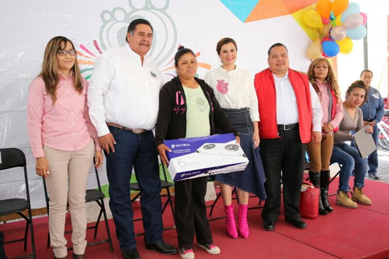 Cristina Rodríguez de Tello, presidenta honorifica del Sedif, entregó paquetes de aves de traspatio, bicicletas y becas de los programas de Educación Superior, Manutención y Bécalos.