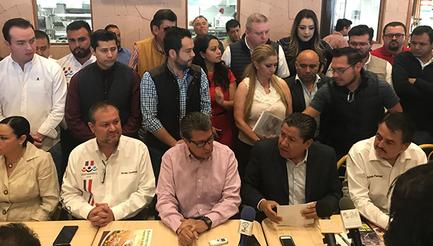 En la rueda de prensa estuvieron Alfredo Femat Bañuelos, dirigente del PT, Nicolás Castañeda Tejeda, de Encuentro social y el coordinador circunscripción 2, Ricardo Monreal Ávila, ex gobernador de Zacatecas.