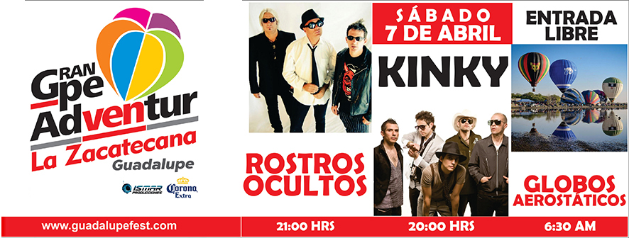 El sábado 7 de abril se llevará a cabo la segunda edición del Guadalupe Adventur 2018 con la presencia de más de 20 globos aerostáticos, campeonato estatal de Lucha libre, conciertos de rock con la participación de: Pacal, Messier 33, No somos nadie, Los amantes de la Chesca, Buena M, Andrés Margar, Linterna, Tropicornia, Aurea Hip Hybride, Rufys Taylor Blues Band, Urbanicidio, Segundo Lugar, Moan Bluesn y Nuclear de Mollition.