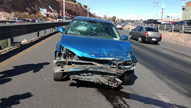 La víctima iba a bordo de un Nissan Sentra azul, pero al bajar del puente que se ubica en el crucero de la Calzada Solidaridad y la carretera a Sauceda de la Borda, se impactó con la barrera central de la rúa.