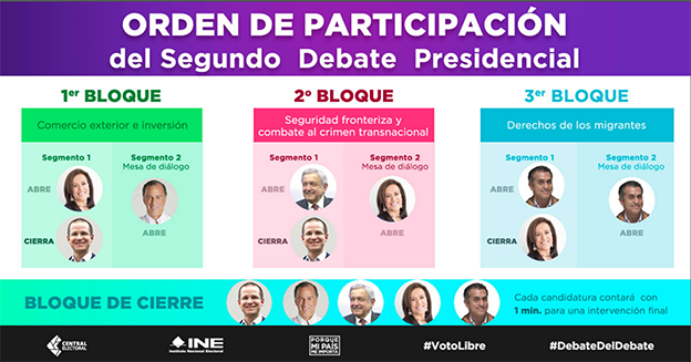 El debate presidencial se dividirá en tres bloques temáticos: el primero, con el subtema “Comercio exterior e inversión”; el segundo, sobre “Seguridad fronteriza y combate al crimen transnacional”, y el tercero, en torno a “Derechos de los migrantes”.