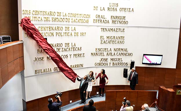 Zacatecas, Zac.- En sesión solemne de la LXII Legislatura local, autoridades de los tres Poderes develaron, en el muro de honor y en letras doradas, la inscripción: 2018, Centenario de la Constitución Política del Estado de Zacatecas.