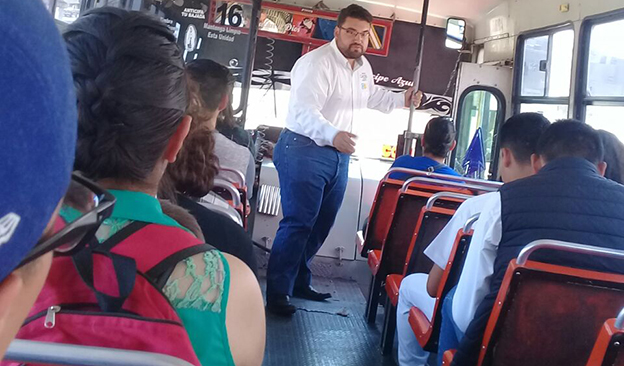 Guadalupe, Zac.- El candidato a la presidencia municipal de Guadalupe, por la Coalición Por Zacatecas al Frente, Jesús Reyes “Cachus”, recorrió esta mañana las distintas rutas por las que transita el transporte público, en donde platicó con los ciudadanos sobre su recurrente problemática que enfrentan día con día en sus traslados.