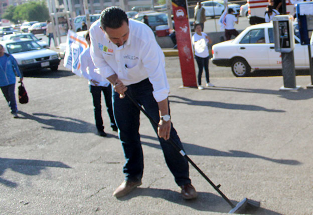 Zacatecas, Zac.- En su cometido de tener una ciudad más limpia para todos, Arturo López de Lara, candidato a la Presidencia Municipal de Zacatecas por la alianza PAN-PRD-MC, realizó con su brigada una actividad de limpia en las principales calles del centro.
