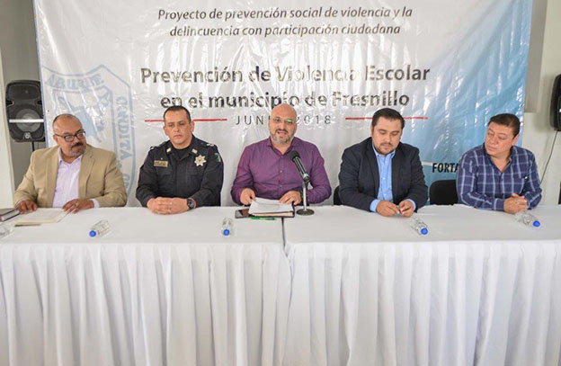 FresnilloFresnillo, Zac.- “Hagamos de nuestros planteles educativos espacios libres de violencia” comentó el Secretario de Gobierno, Daniel Isaac Ramírez Díaz en rueda de prensa que se llevó a cabo para dar a conocer el proyecto de “Prevención de Violencia Escolar en el Municipio de Fresnillo” como parte de las acciones realizadas dentro del Programa de Fortalecimiento para la Seguridad (FORTASEG) 2018.