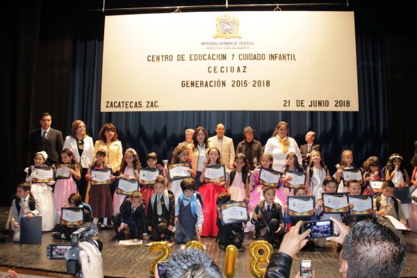 Zacatecas, Zac.- El Centro de Educación y Cuidado Infantil de la UAZ (CECIUAZ) despidió el día de hoy a 77 pequeños de la generación 2015-2018, que concluyeron su educación preescolar en una ceremonia de graduación.
