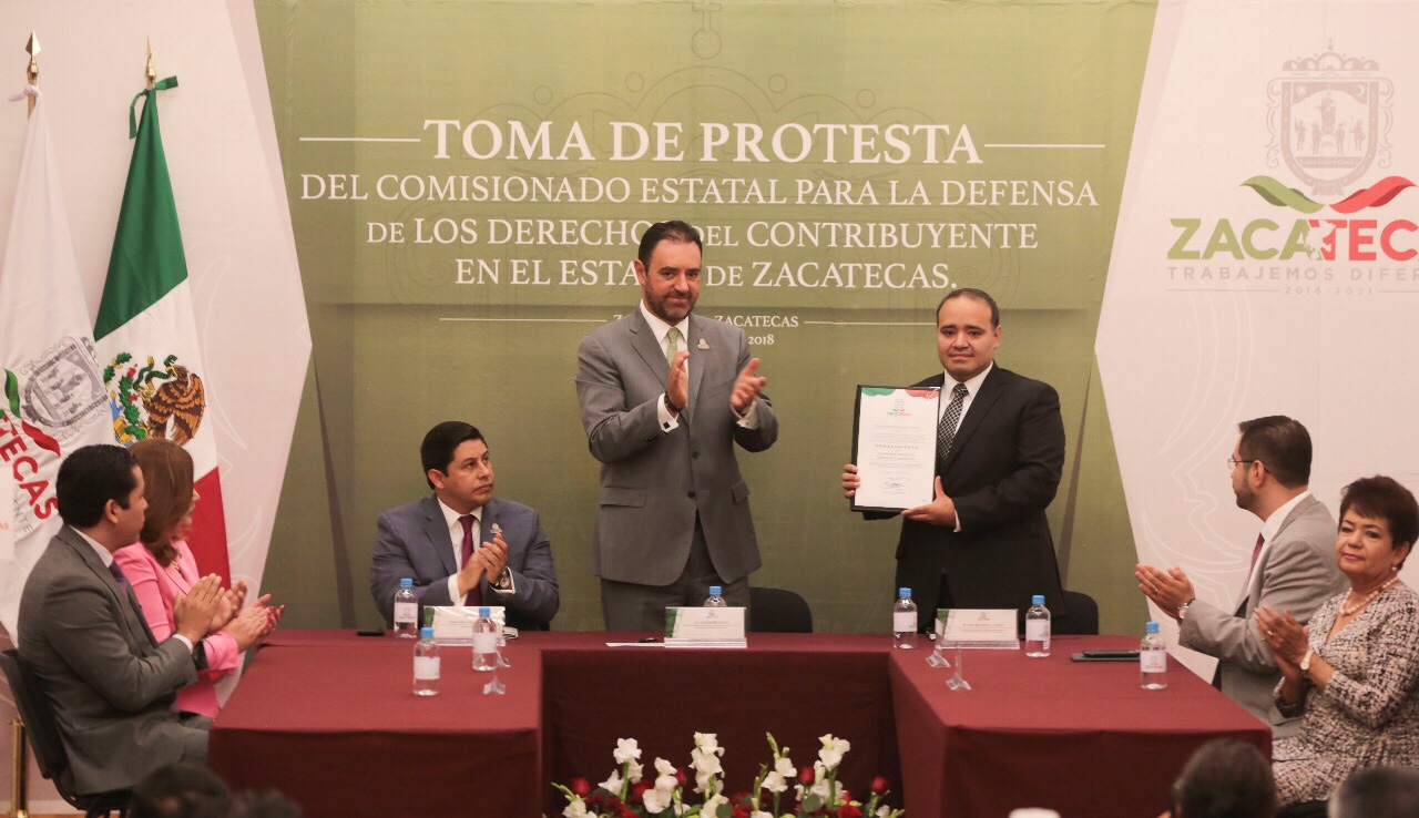 Zacatecas, Zac.- Con el fin de crear un instrumento jurídico que garantice seguridad y confianza a la ciudadanía sobre el pago de sus impuestos, el Gobernador Alejandro Tello Cristerna tomó protesta al primer titular de la Comisión Estatal de Defensa del Contribuyente (Cedecon), Eduardo Noyola Núñez.