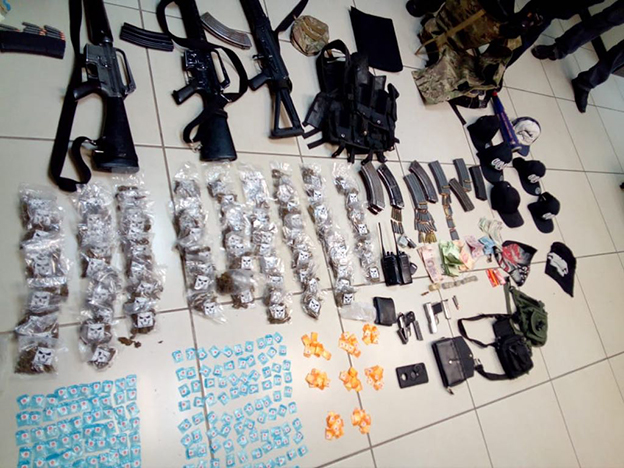 En total fueron detenidos cuatro hombres, quienes estaban en posesión de armas de fuego, droga y equipo táctico.
