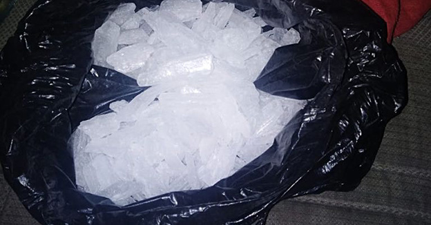 Asimismo, fue encontrado en posesión de una bolsa de plástico tipo camiseta, color negro, en cuyo interior había una sustancia granulada y cristalina, con las características de la droga conocida como Cristal.