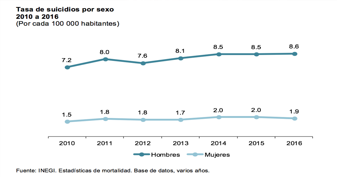 En seguida se observa que esta acentuación de los suicidios en los hombres ha sido algo continúo y ha venido cuadruplicando el riesgo en comparación a las mujeres. Para 2016, los hombres presentaron una tasa de 8.6 suicidios por cada 100 mil hombres mientras que en las mujeres fue de 1.9 por cada 100 mil mujeres.
