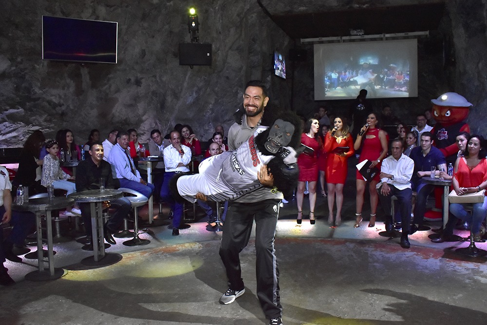 En el centro de la pista, también hicieron su aparición, el peculiar chango, mascota nombrada como “la carta fuerte”, y la nueva versión de Roque “El Minero”, botarga oficial, quienes para sorpresa de todos los presentes, se enfrascaron en un gran duelo de baile en el que ambos quisieron mostrar sus mejores pasos, pero fueron derrotados por un retador incógnito, que salió de entre el público para llevarse los aplausos del respetable y resultó ser Enrique Álvarez, coreógrafo del grupo de animación.