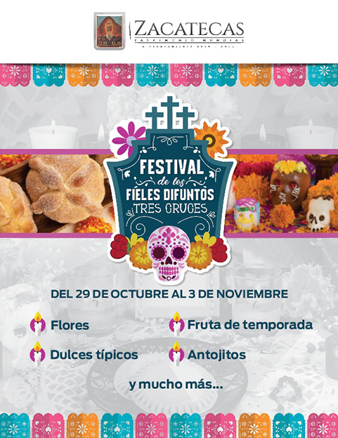Zacatecas, Zac.- Con el objetivo de promover el rescate de las tradiciones y fortalecer la convivencia familiar con actividades recreativas, se llevará a cabo del 29 de octubre al 03 de noviembre el “Festival de los Fieles Difuntos” en la avenida Julio Ruelas de la Colonia Tres Cruces de la capital zacatecana.