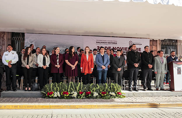 Zacatecas, Zac.- Con los Valores como tema del desfile cívico para conmemorar el 108 “Aniversario de la Revolución Mexicana”, Julio César Chávez, Presidente Municipal de Guadalupe y autoridades del ayuntamiento, se dieron cita al frente del palacio de gobierno municipal para atestiguar el tradicional desfile que conjunto a más de medio millar de participantes.