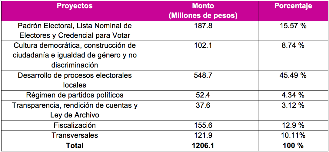 Los proyectos presupuestados por el Instituto para el próximo ejercicio fiscal, cuyo monto global asciende a 1,206.1 millones de pesos, se distribuye de la siguiente manera: