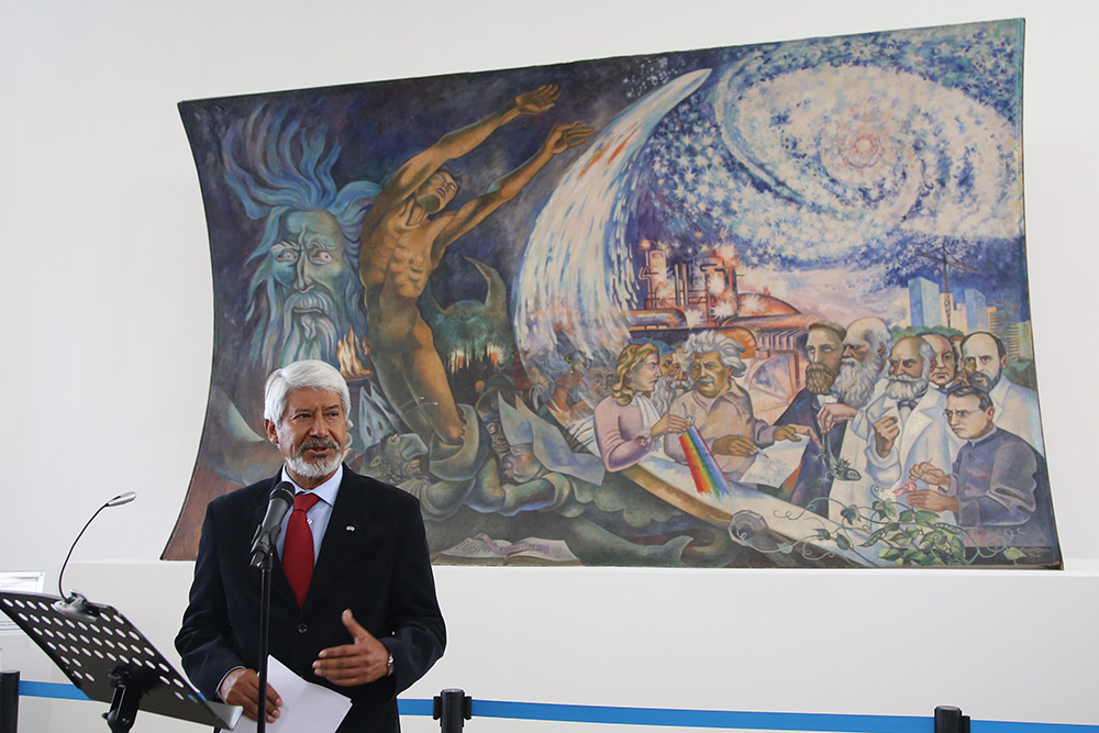 El doctor José Luis Morán López, presidente de la Academia Mexicana de Ciencias, presenta el mural “Claridad científica frente a los dogmas y fanatismos” también conocido como “El oscurantismo frente a la claridad de la ciencia”, del pintor chileno Osvaldo Barra Cunningham, donado por la familia del científico Mauricio Russek Berman, obra que se exhibe en el vestíbulo del auditorio Galileo Galilei. (Fotos: Elizabeth Ruiz Jaimes/AMC.)