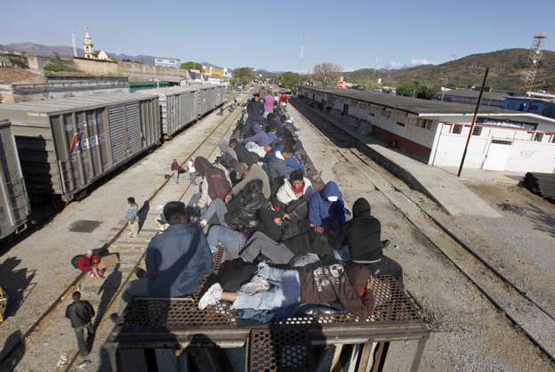 Central American migrants ride on top of a northern bound train during their journey toward the US-Mexico border in Arriaga, in the state of Chiapas, Mexico, Thursday Feb. 3, 2011. Migrants crossing Mexico to get to the U.S. have increasingly become targets of criminal gangs who kidnap them to obtain ransom money. (AP Photo/Eduardo Verdugo)