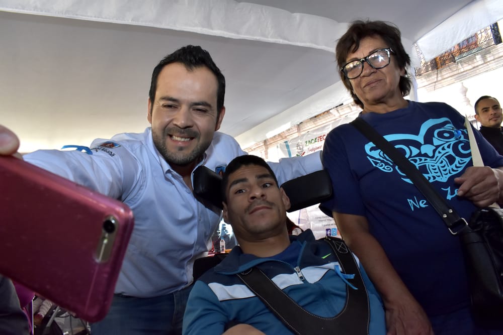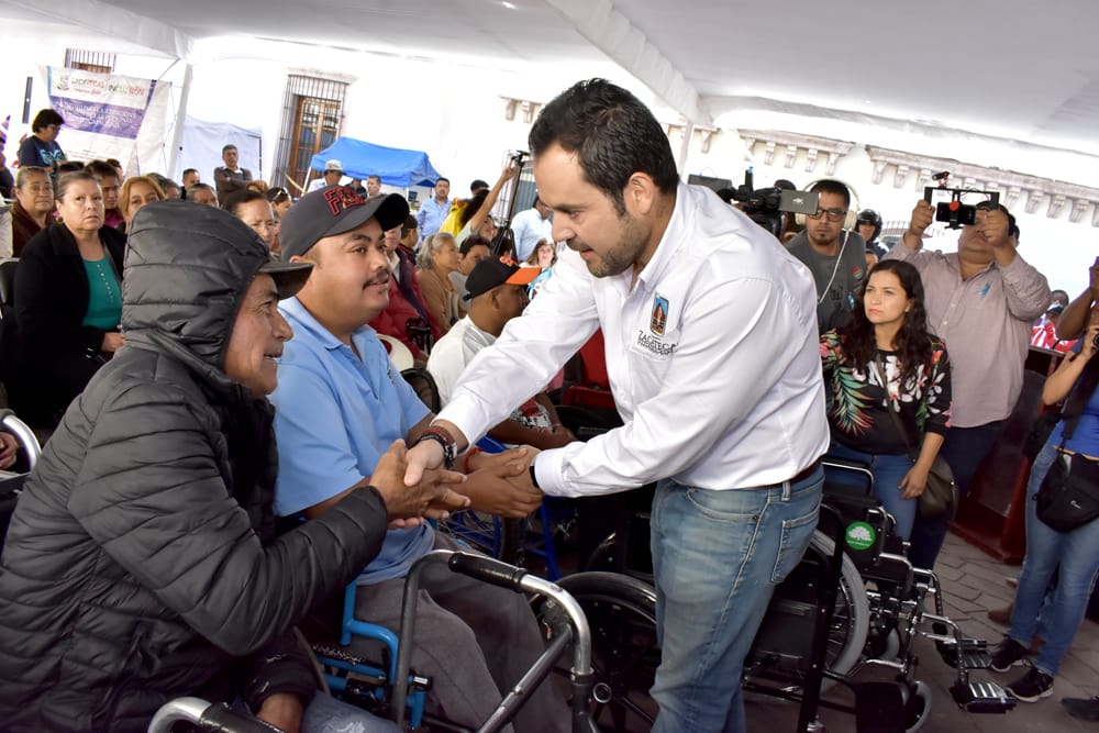 Zacatecas, Zac.- Con gran afluencia se llevó a cabo la audiencia pública número 20 del Ayuntamiento de Zacatecas en Plaza de Armas, dedicada especialmente a personas con discapacidad, con el compromiso del presidente municipal Ulises Mejía Haro de mejorar la calidad de vida de este sector con la entrega de sillas de ruedas, bastones, andaderas, fajas, pañales, sillones ortopédicos entre otros aparatos funcionales que faciliten su movilidad y rehabilitación.