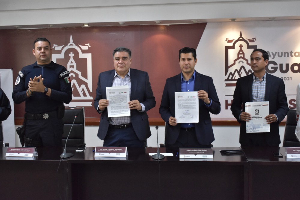 Zacatecas, Zac.- Con la finalidad de contribuir al desarrollo de competencias, capacidades y habilidades de los integrantes de las instituciones policiales, teniendo un carácter permanente y progresivo, el Ayuntamiento de Guadalupe, a través del primer edil Julio César Chávez y el Secretariado Ejecutivo del Sistema Estatal de Seguridad Pública del Estado, por medio del Instituto de Formación Profesional, firmaron un convenio en materia de profesionalización y certificación policial para capacitar a todos los elementos de la Dirección de Seguridad del municipio.