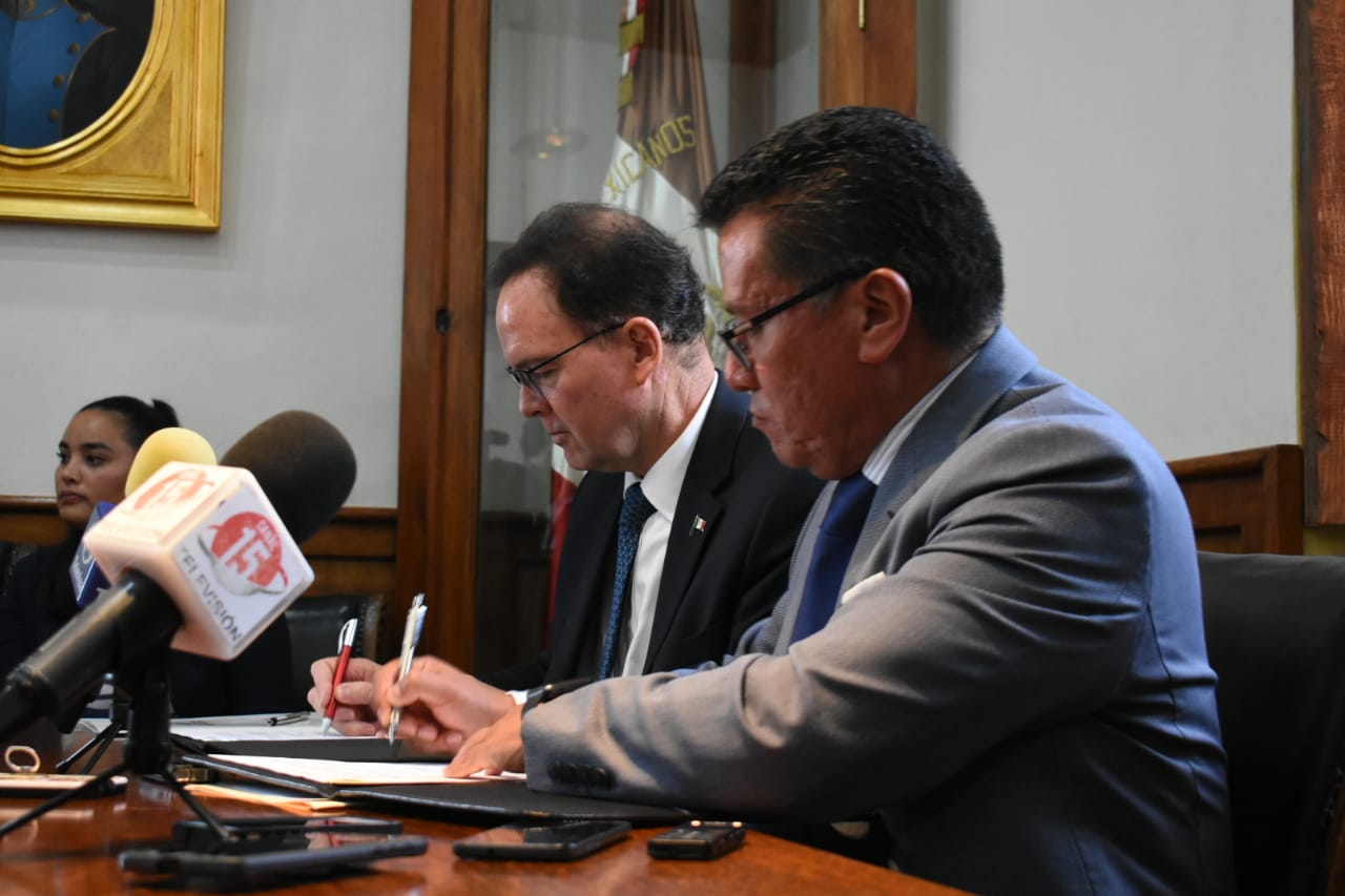 Zacatecas, Zac.- Con el propósito de establecer las bases para equipar una sala para la celebración de audiencias en materia mercantil en el Distrito Judicial de la Capital, mediante mobiliario y tecnología para el registro de audio y video, el Tribunal Superior de Justicia del Estado de Zacatecas (TSJEZ) por conducto del Magistrado Presidente, Armando Ávalos Arellano y la Secretaría de Economía del Gobierno del Estado (SEZAC) por medio de su titular, el Ingeniero Carlos Bárcena Pous celebraron un convenio de colaboración.