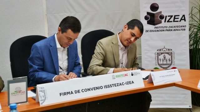 Zacatecas, Zac.- Los directores generales de los institutos Zacatecano para la Educación de los Adultos (IZEA) y de Seguridad y Servicios Sociales de los Trabajadores del Estado (Issstezac), Carlos Peña Badillo y Francisco Javier Martínez Muñoz, respectivamente, firmaron un convenio para abatir el rezago educativo entre el personal de esta última instancia.