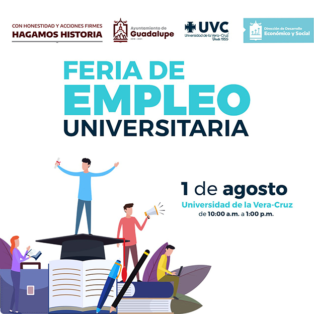 Zacatecas, Zac.- Para vincular a los jóvenes recién egresados con la oferta laboral del sector empresarial, el Ayuntamiento de Guadalupe, Zacatecas, que encabeza Julio César Chávez Padilla, a través de la Dirección de Desarrollo Económico y Social, promueve la Primera Feria del Empleo Universitaria, que tendrá lugar en la Universidad de la Vera-Cruz, de 10 de la mañana a 1 de la tarde.
