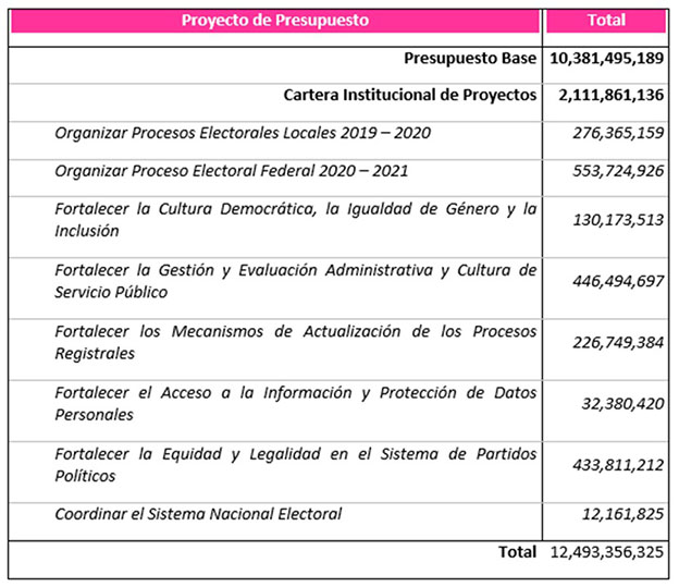 Los 2,112 millones de pesos previstos para la cartera de proyectos corresponden a los gastos e inversiones que de manera temporal tendrá que realizar el Instituto el próximo año. Aquí se incluyen los costos de la organización de las elecciones locales a celebrarse en 2020 y los relacionados con el inicio del Proceso Electoral Federal y locales coincidentes 2020-2021.