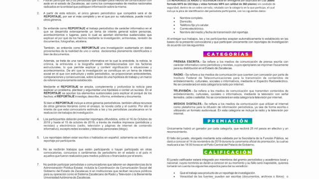 Quienes participen deben ser periodistas o comunicadores que no laboren en dependencias de la Administración Pública Estatal, ni en instituciones que reciban recursos públicos para su operación, como el Sistema Zacatecano de Radio y Televisión (Sizart) o la Benemérita Universidad Autónoma de Zacatecas (BUAZ).