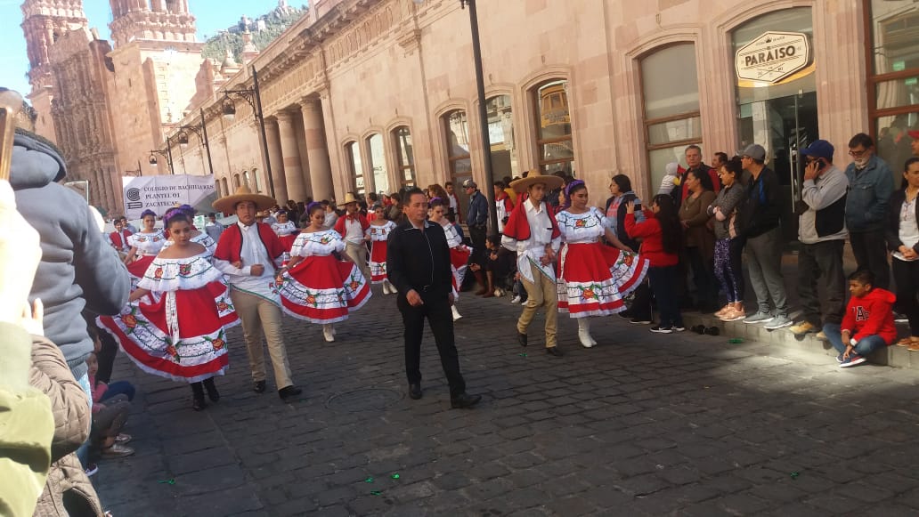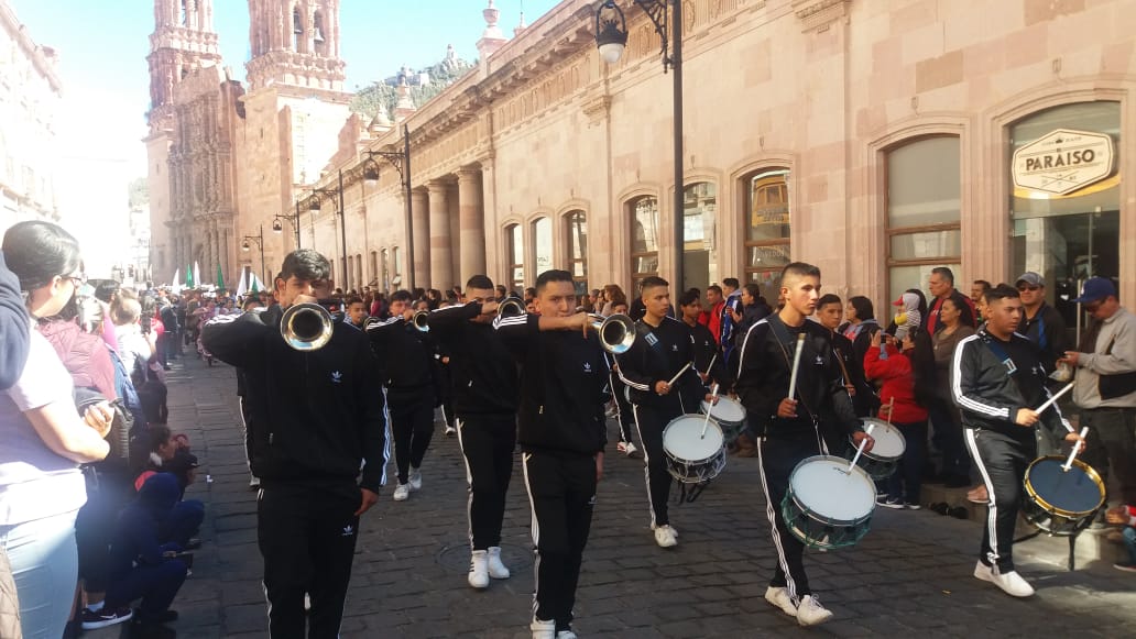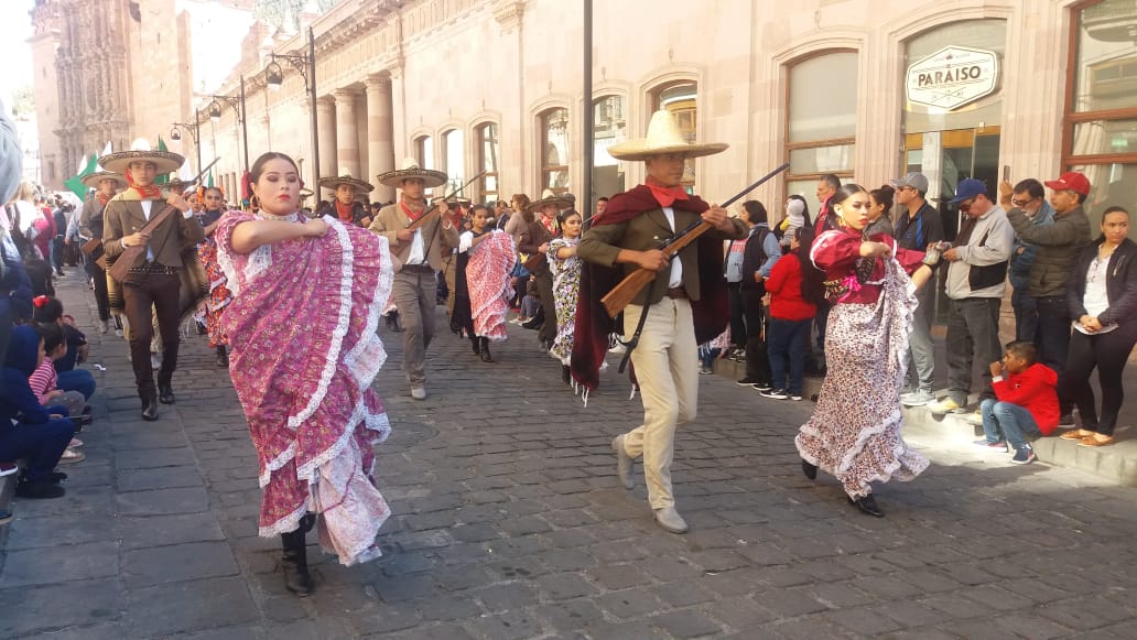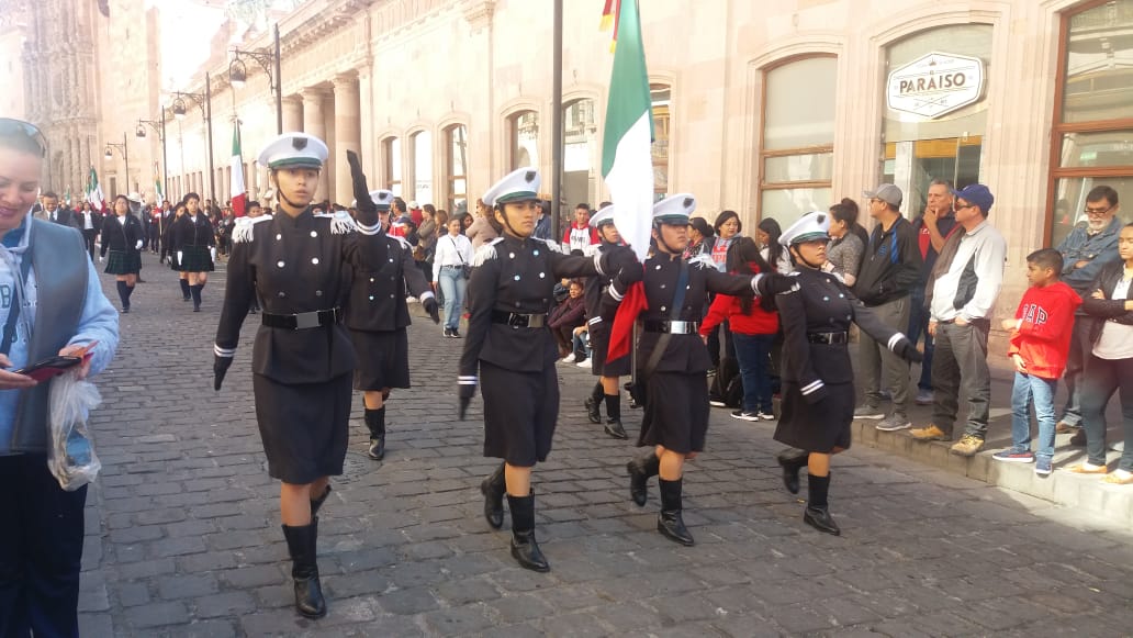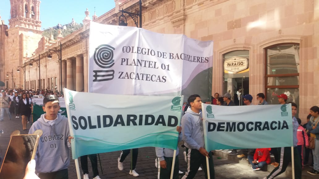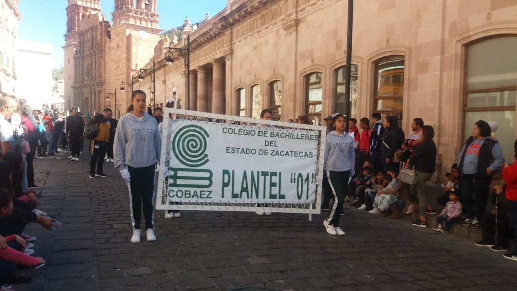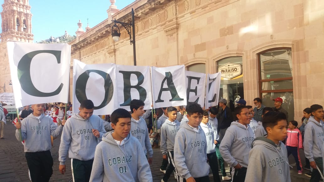 Zacatecas, Zac.- Entusiastas alumnos del Plantel 01 Zacatecas del Colegio de Bachilleres del Estado de Zacatecas (COBAEZ), participaron en el desfile conmemorativo por el 109 aniversario de la Revolución Mexicana.