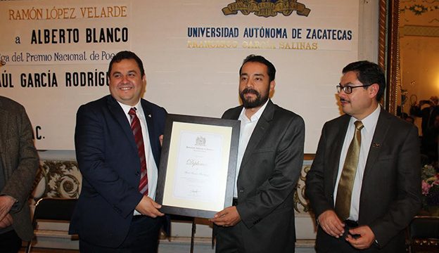 Zacatecas Zac.-El rector de la Universidad Autónoma de Zacatecas (UAZ), Antonio Guzmán Fernández, entregó los premios nacional e internacional de Poesía Ramón López Velarde en su edición 2019 a los poetas Raúl García Rodríguez y Alberto Blanco, respectivamente, como ganadores de ese reconocimiento poético desde Zacatecas.