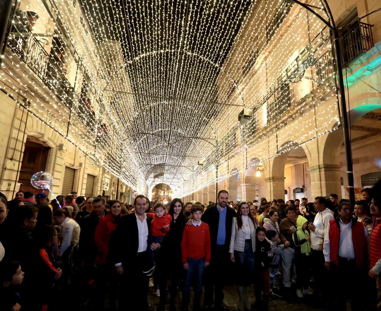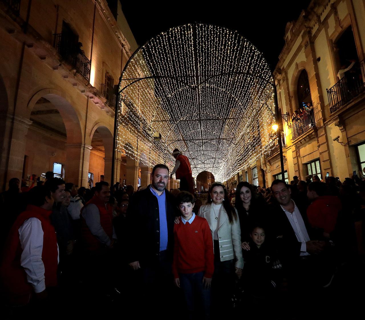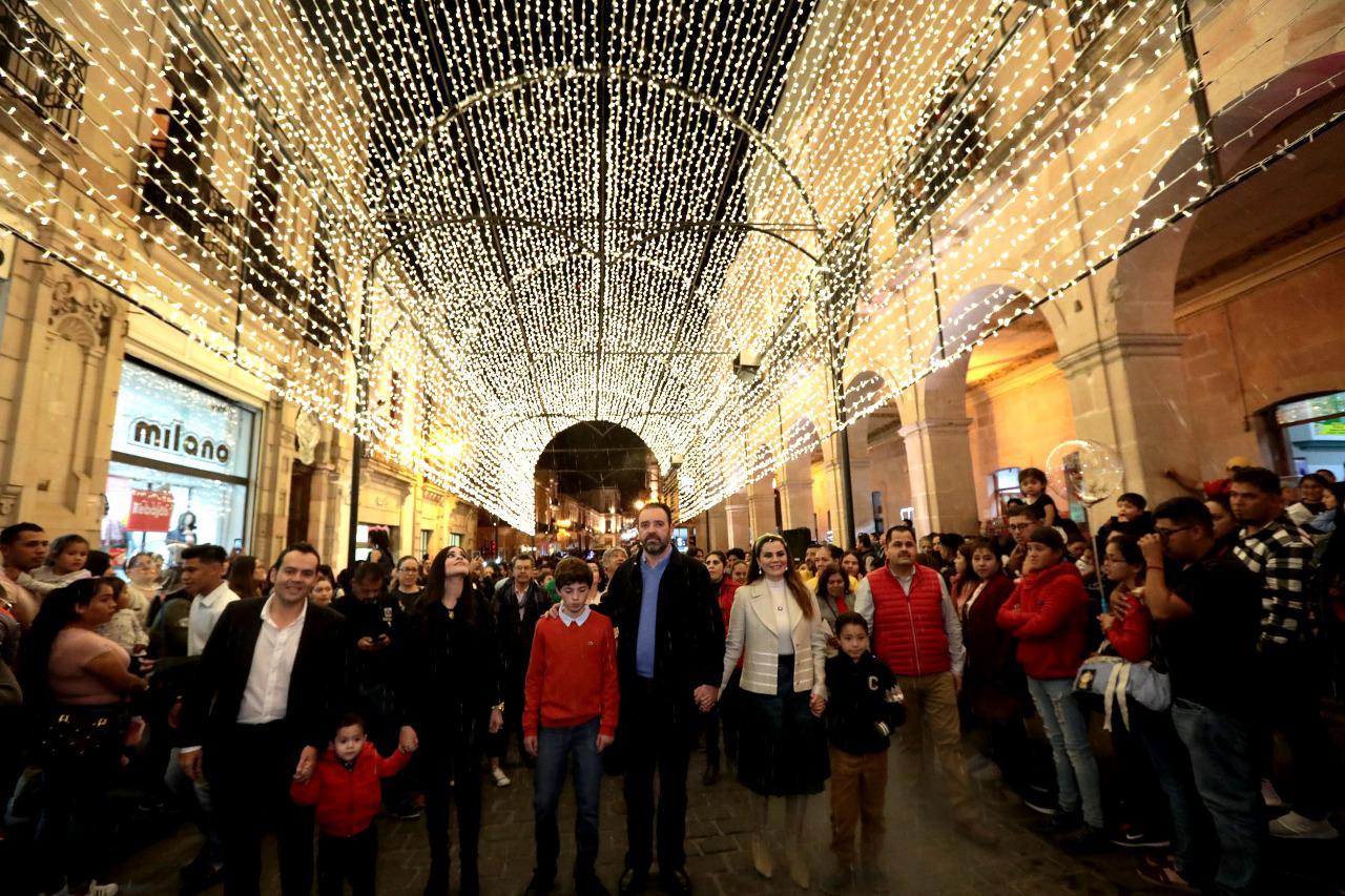 Esta noche el mandatario estatal, acompañado de su familia, dio inicio a las actividades con el encendido navideño de la Máquina del 3030; el túnel de luz de la avenida Hidalgo; callejones como el de Cuevas, de la Bordadora, de la Palma, de las Campañas y las plazuelas de la Caja, Miguel Auza y Goitia.