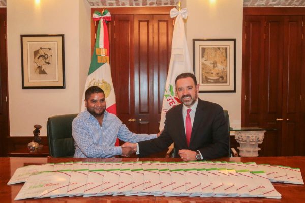 Zacatecas, Zac.- El Gobernador Alejandro Tello entregó escrituras del Programa Vivienda Joven al alcalde de General Pánfilo Natera, Juan Pablo Contreras López.