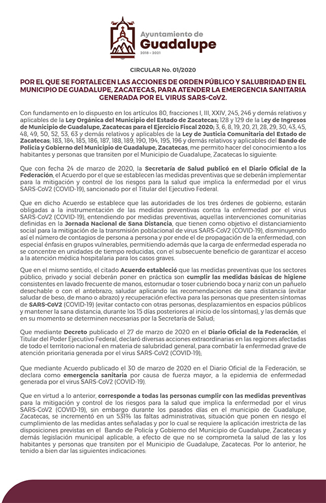 Zacatecas, Zac.- Luego de la declaratoria de emergencia sanitaria por la epidemia generada por el virus SARS-CoV2, el Ayuntamiento de Guadalupe emitió la circular 01/2020 por el que se fortalecen las acciones de orden público y salubridad en el municipio de Guadalupe, Zacatecas, para atender la emergencia sanitaria generada por el virus SARS-CoV2.