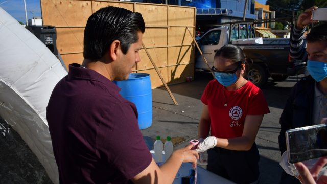Al entrar al túnel, el alcalde explicó que para un mejor efecto del líquido sanitizador, se recomienda levantar las manos para exponer más martes del cuerpo a la brisa, “al salir hay otro filtro con los elementos de Protección Civil del municipio”, donde miden la temperatura con termómetros infrarrojos, así como oxigenación en la sangre, además de aplicarles gel antibacterial.