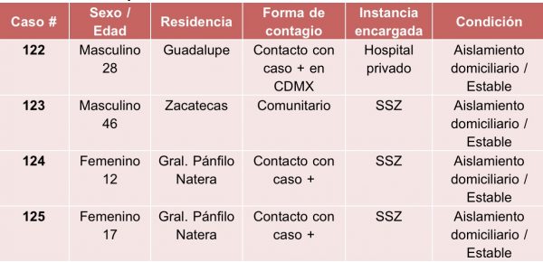 Zacatecas, Zac. 6 de mayo de 2020.- Con cuatro nuevos casos, registrados hoy, el número de casos positivos de Coronavirus (COVID-19) llegó a 125 en Zacatecas, informó Gilberto Breña Cantú, titular de la Secretaría de Salud estatal (SSZ).