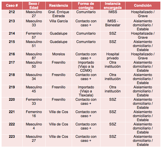 Zacatecas, Zac. 21 de mayo de 2020.- Esta tarde, el Sector Salud estatal registró 12 nuevos casos positivos de Coronavirus (COVID-19) en Zacatecas, según lo informado por Gilberto Breña Cantú, titular de la Secretaría de Salud en la entidad (SSZ), quien añadió que con estos, la cifra total de casos alcanzó los 223.